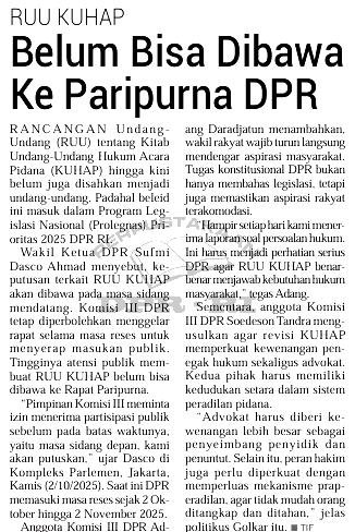 | Judul | RUU KUHAP belum bisa dibawa ke Paripurna DPR |