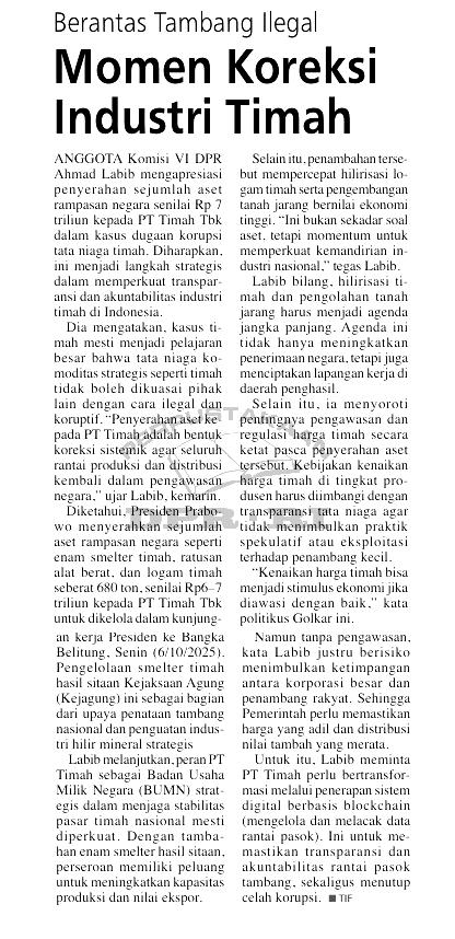 | Judul | Berantas tambang ilegal, momen koreksi industri timah |