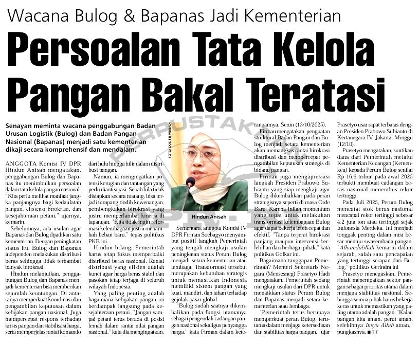 | Kata Kunci | Badan Urusan Logistik,Hindun Anisah,efisiensi,birokrasi,petani,distribusi,beras,Firman Soebagyo,Prasetyo Hadi |