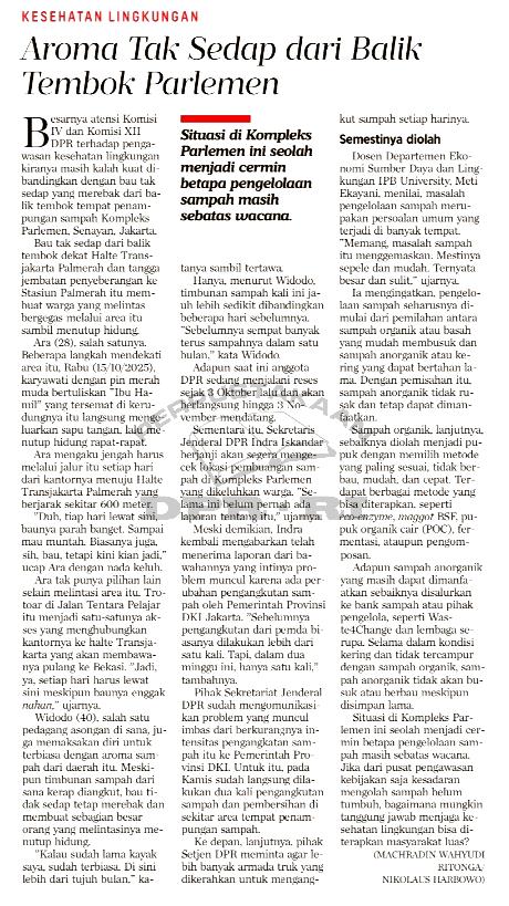 | Kata Kunci | kesehatan,lingkungan,sampah,stasiun,palmerah,halte,transjakarta,pedagang,asongan,Indra Iskandar,pengangkutan,Pemerintah Provinsi,DKI,armada,truk,Departemen Ekonomi Sumber Daya dan Lingkungan,IPB,Meti Ekayani,organik,anorganik,pupuk,eco-enzyme,maggot BSF,POC,Pupuk Organik Cair,fermentasi,pengomposan |