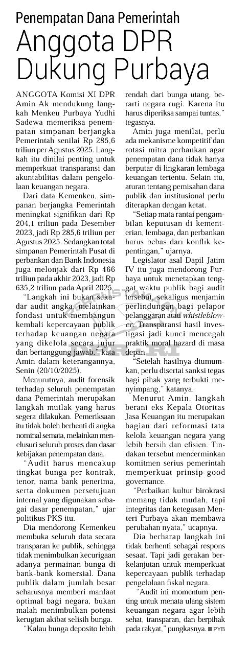 | Judul | Penempatan dana pemerintah: Anggota DPR dukung Purbaya |
