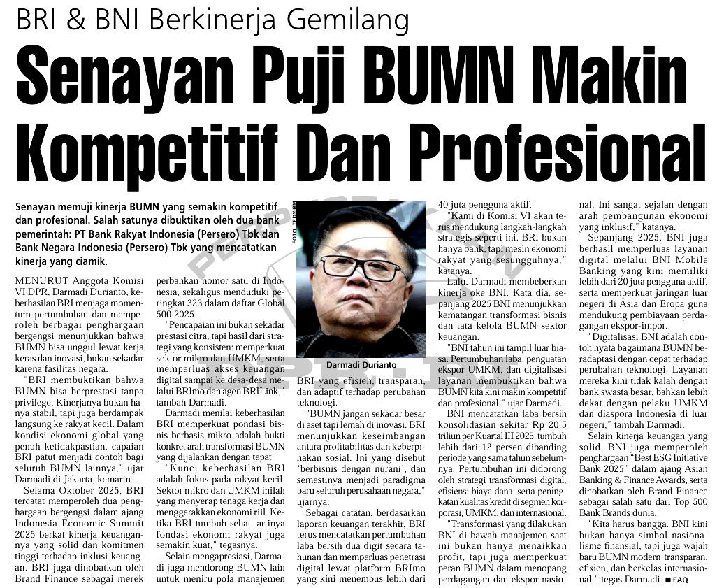| Judul | BRI & BNI Berkinerja gemilang, Senayan puji BUMN makin kompetitif dan profesional |