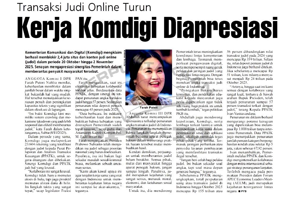| Judul | Transaksi judi online turun, kerja Komdigi diapresiasi |