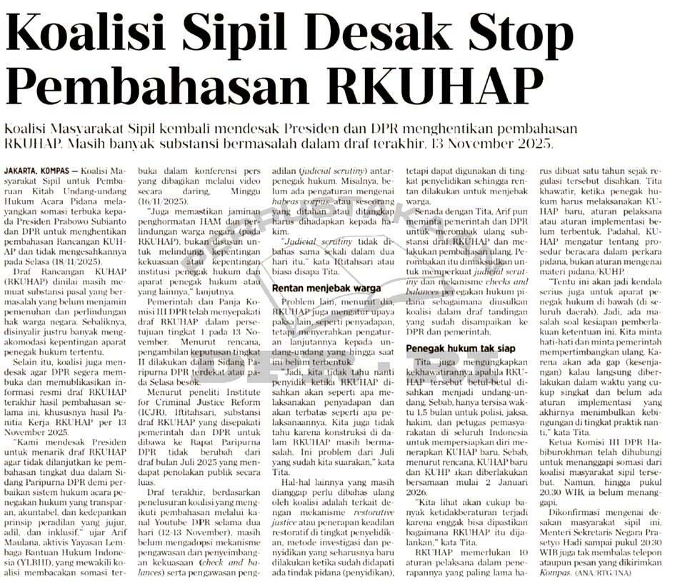 | Judul | Koalisi sipil desak stop pembahasan RKUHAP |