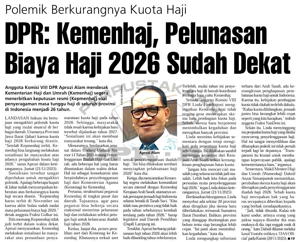 | Judul | Polemik berkurangnya kuota haji, DPR: Kemenhaj,pelunasan biaya haji 2026 sudah dekat |