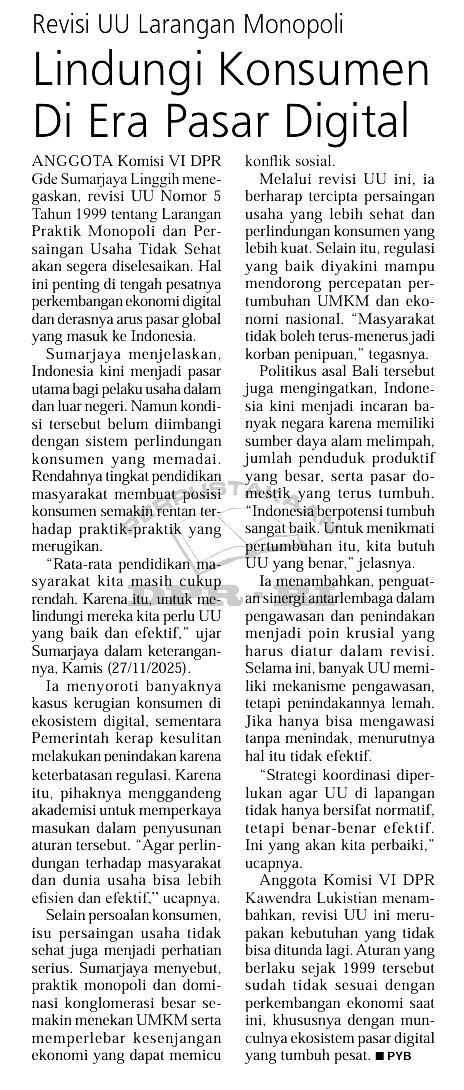 | Kata Kunci | Gde Sumarjaya Linggih,Larangan Praktik Monopoli dan Persaingan Usaha Tidak Sehat,konsumen,ekosistem,digital,UMKM,Kawendra Lukistian,ekonomi |