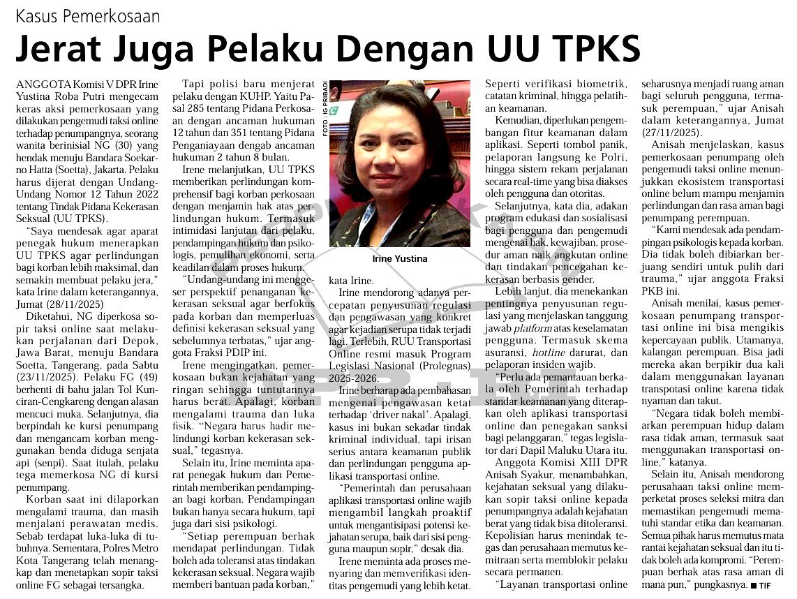 | Kata Kunci | Irine Yustina Roba Putri,taksi,online,Bandara,Soekarno Hatta,Tindak Pidana Kekerasan Seksual,senjata api,trauma,luka,fisik,RUU,Transportasi Online,Anisah Syakur,proses,seleksi,mitra |