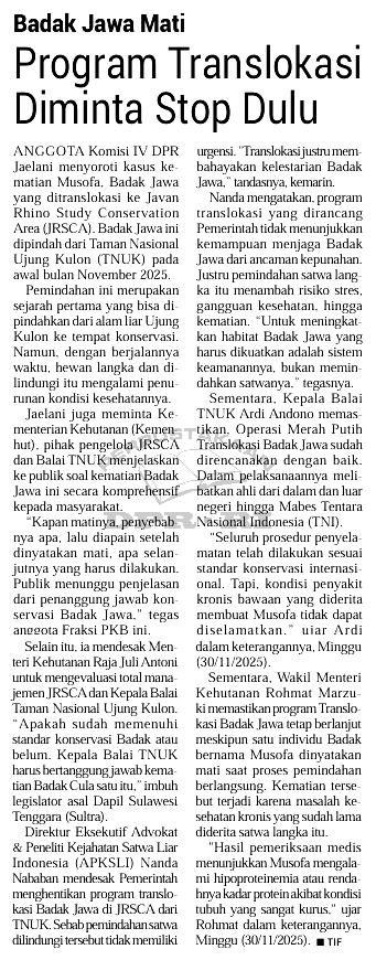 | Judul | Badak Jawa mati: program translokasi diminta stop dulu |