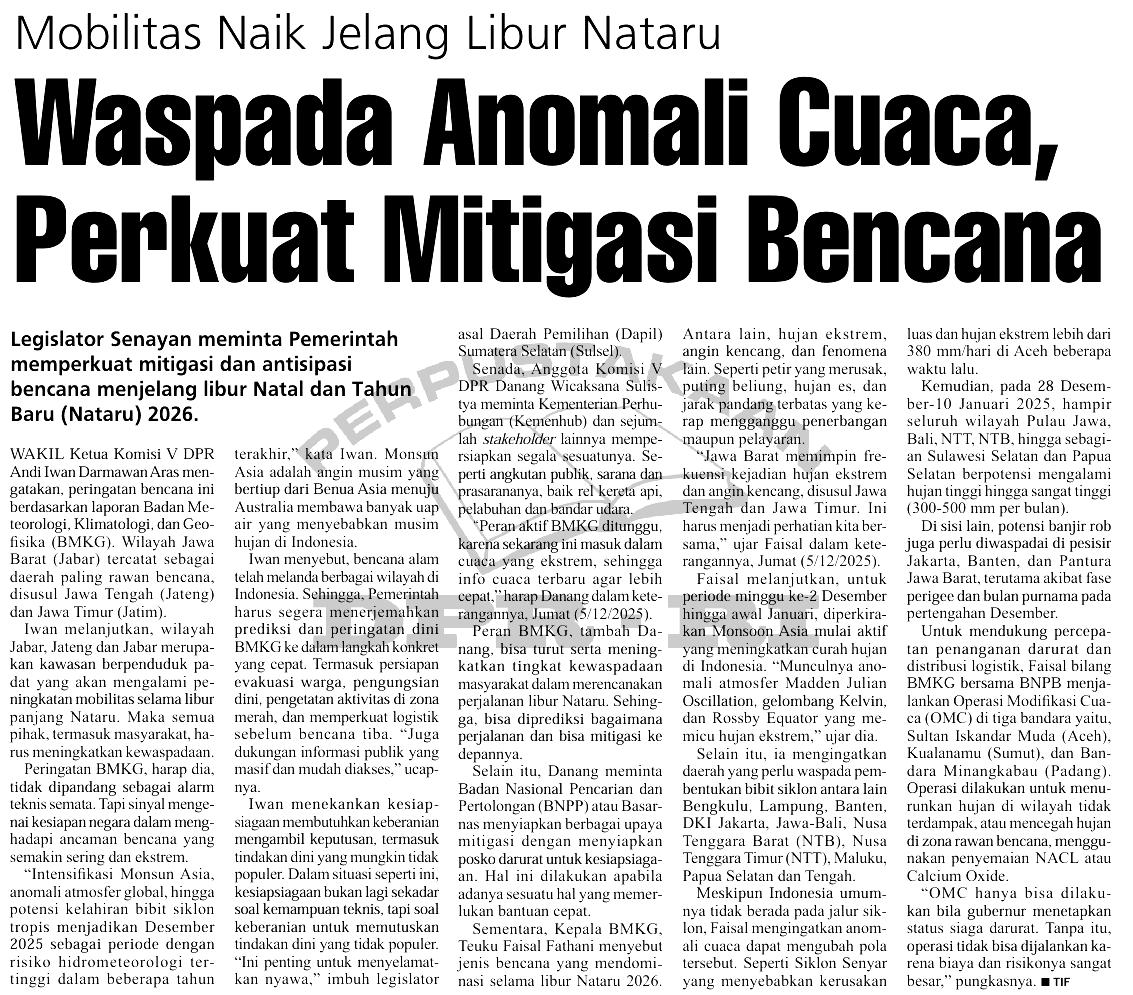 | Judul | Mobilitas naik jelang libut Nataru, waspada anomali cuaca, perkuat mitigasi bencana |