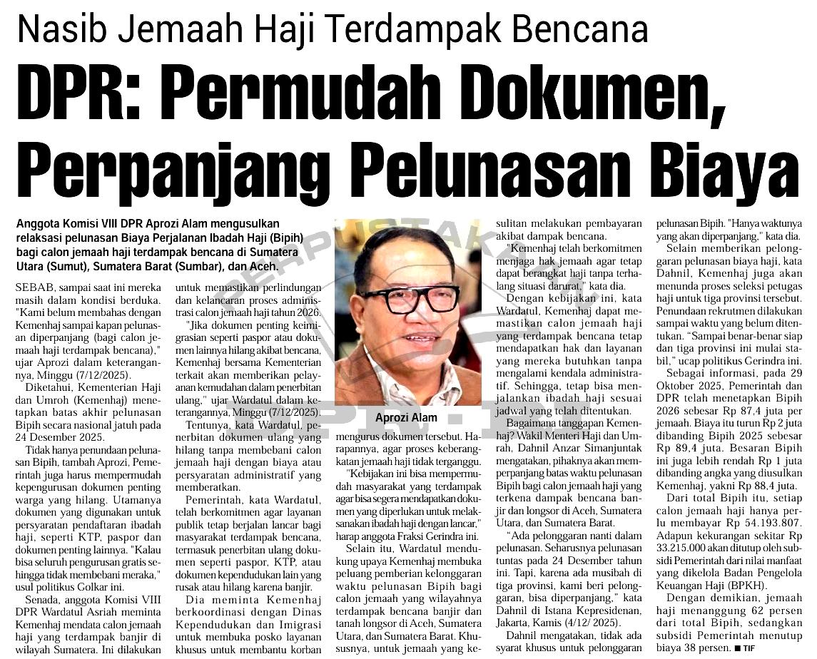 | Kata Kunci | Aprozi Alam,Wardatul Asriah,banjir,Sumatera,proses,administrasi,Dahnil Anzar Simanjuntak,Bipih,Biaya Perjalanan Biaya Haji,BPKH,Badan Pengelola Keuangan haji |