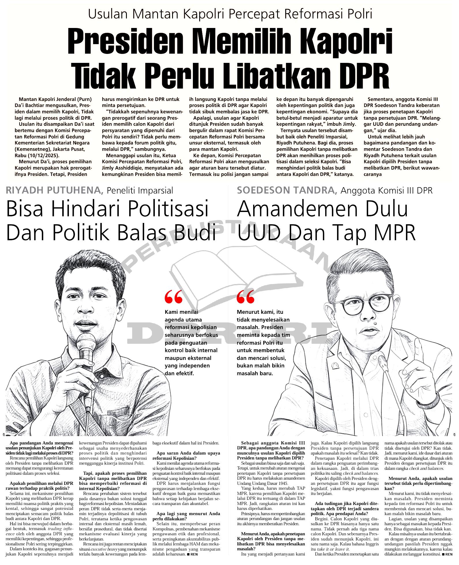 | Judul | Usulan mantan Kapolri percepat reformasi Polri, Presiden memilih Kapolri tidak perlu libatkan DPR |