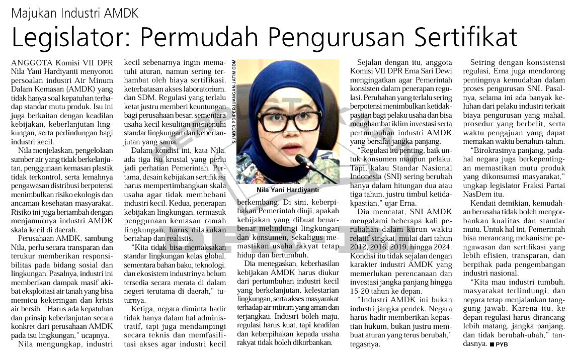 | Judul | Majukan industri AMDK, legislator: permudah pengurusan sertifikat |